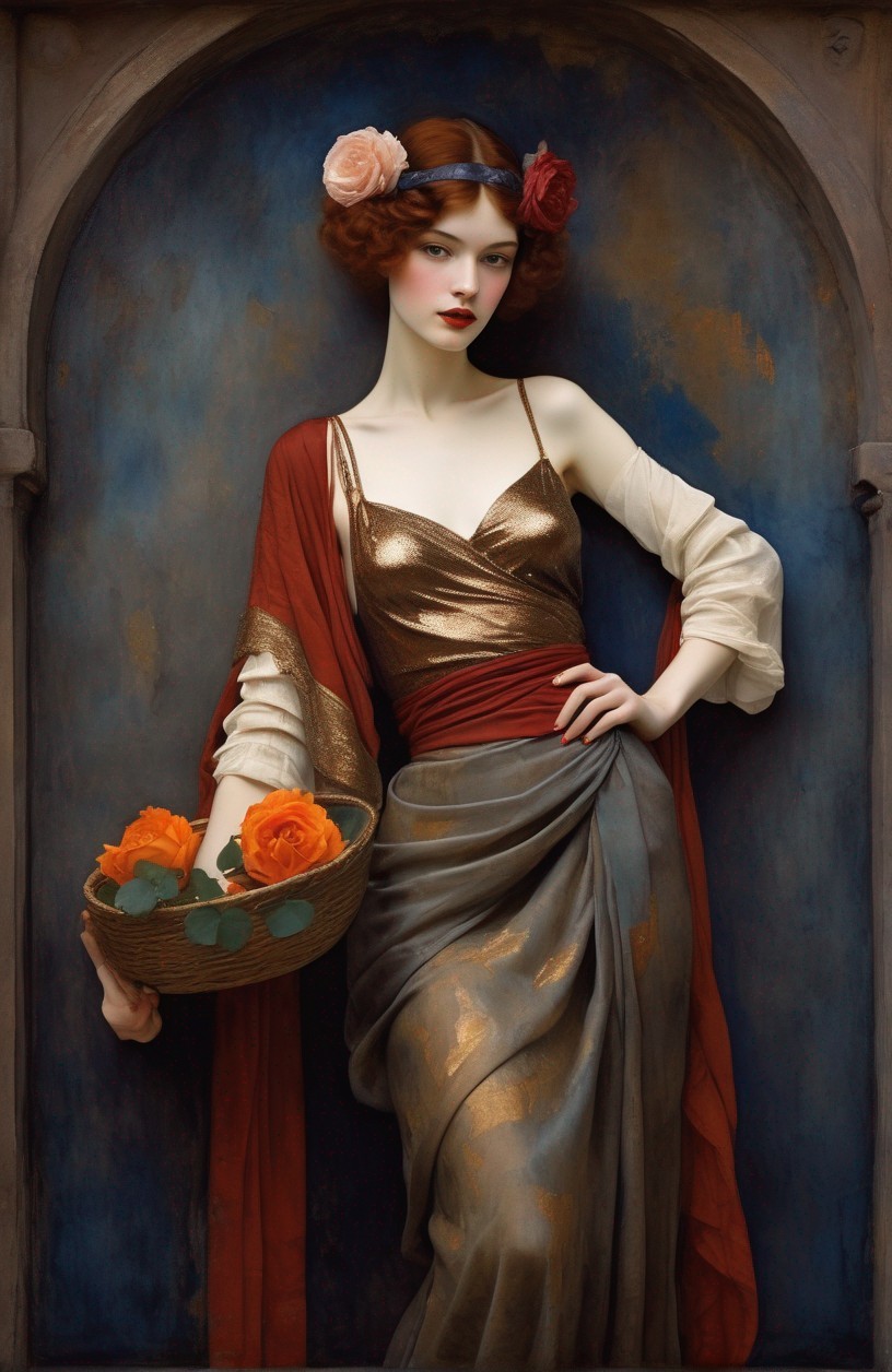 Woman with Red Hair in Gold Top and Burgundy Drapery