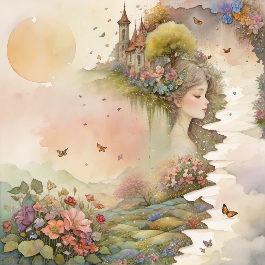 Prompt: A patchwork landscape, petals rain, flowers, watercolor patchwork, speedpaint, small strokes, style of Jean-Baptiste Monge,