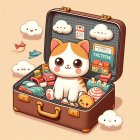 A cute cat toy sits inside a suitcase, surrounded by colorful toy cars and books. Fluffy clouds float above, adding a whimsical touch to this charming travel scene.