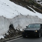 A sleek black muscle car with distinctive headlights parked on a snow-covered road, surrounded by tall pine trees and majestic mountains, creating a striking contrast against the winter landscape.
