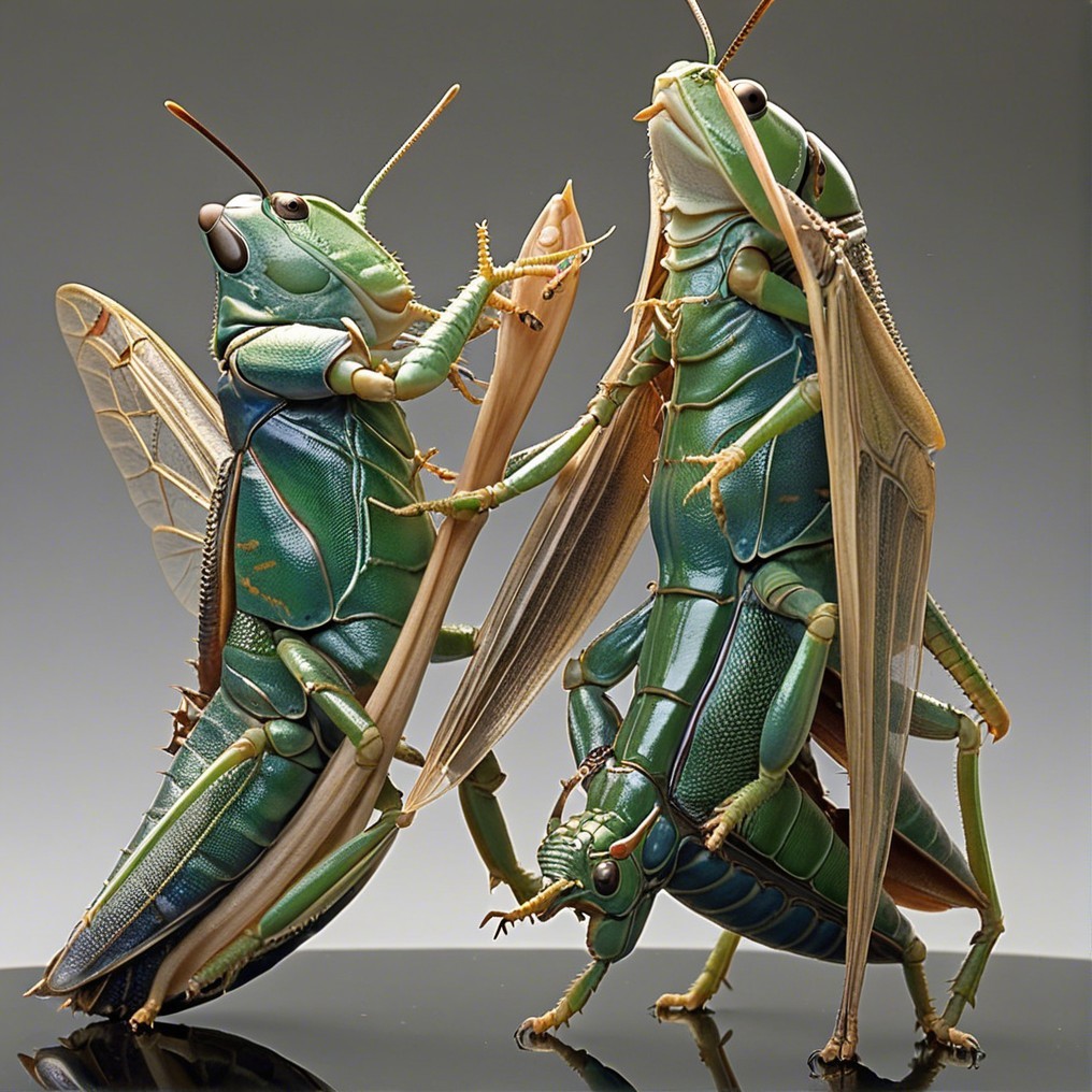 Two vibrant green grasshoppers engage playfully, showcasing their intricate details and textures against a smooth, neutral background. Their large, expressive eyes add to the lively scene.