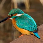 A vibrant kingfisher perched on a surface, showcasing its striking turquoise feathers, bright orange belly, and sharp black beak. The background features soft, blurred shapes, adding depth.