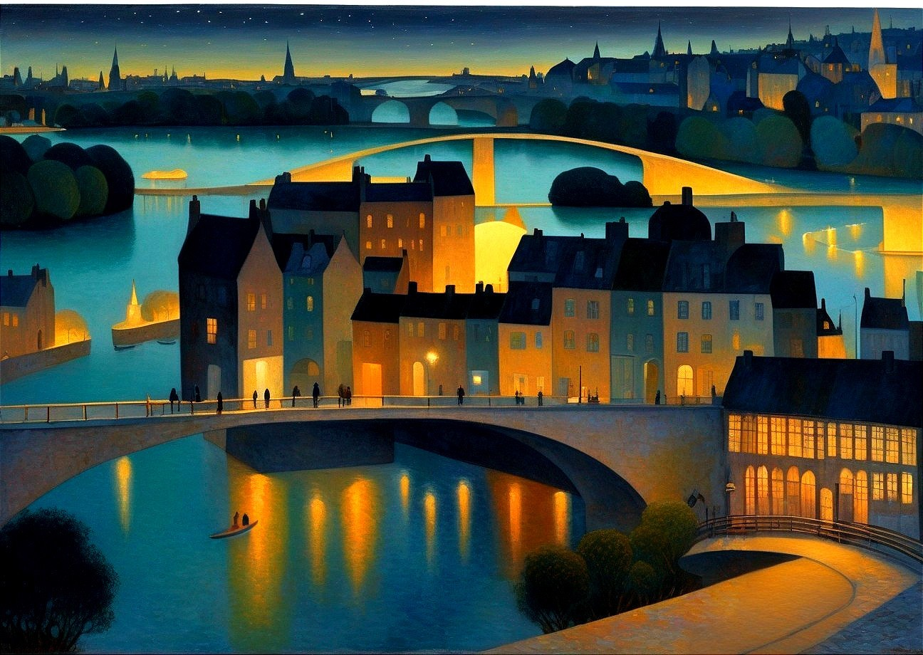A stylized painting of a serene riverside town at dusk, with illuminated buildings, bridges, and a boat gliding on the water.