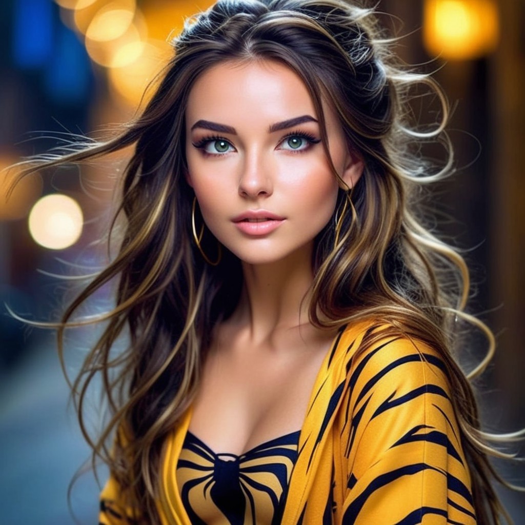 The image features a young woman with long, flowing hair, wearing a striking black and gold dress. The vibrant city skyline glows in the background, adding to the enchanting atmosphere.
