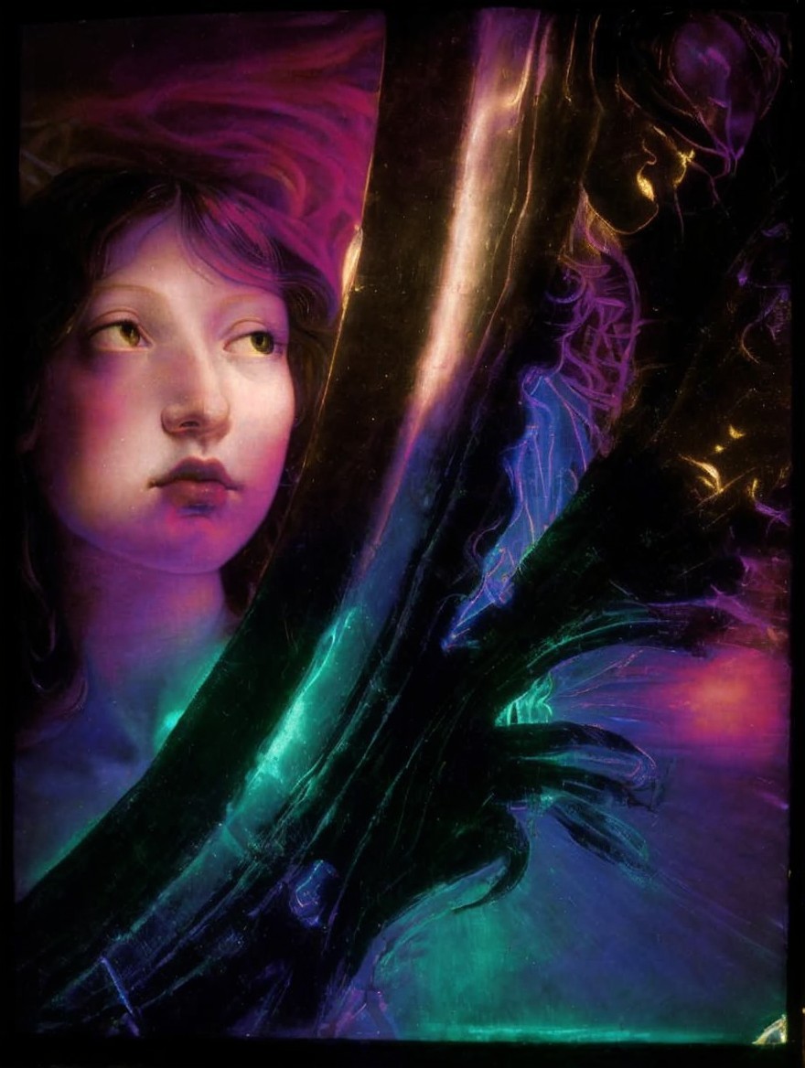 The image features a striking, ethereal portrait of a woman with flowing hair, enhanced by vibrant colors and dramatic lighting, evoking a sense of mystique and beauty.
