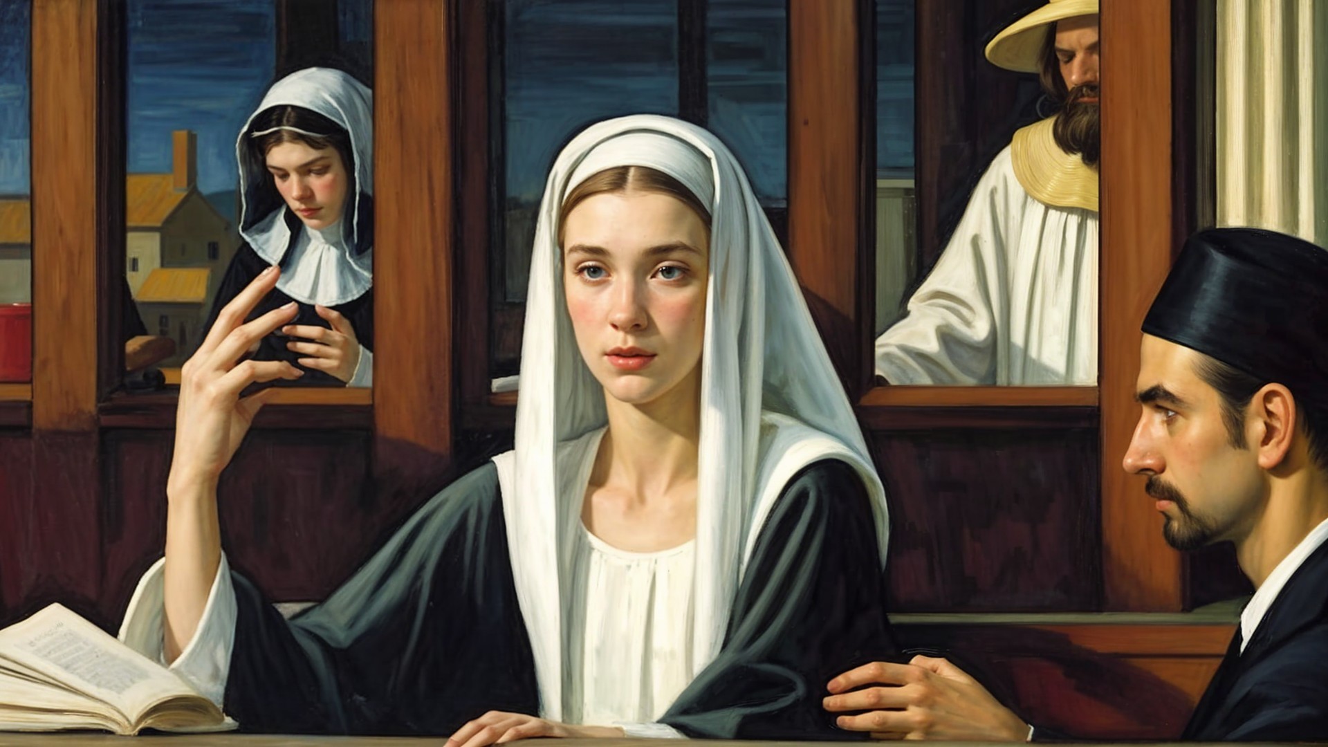 A young woman in a white blouse and headscarf sits at a wooden table, gazing thoughtfully. Behind her, a window reveals a serene landscape, enhancing the introspective mood of the scene.
