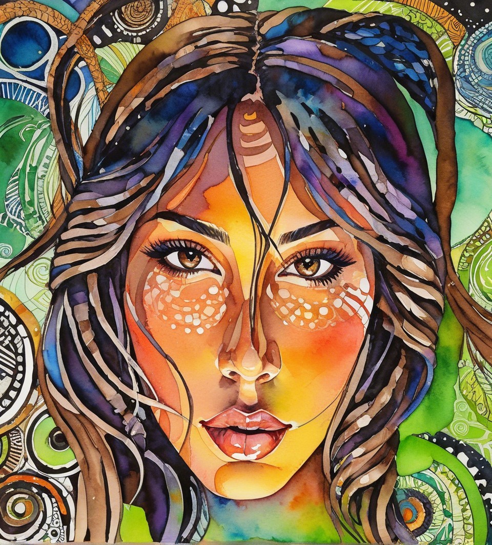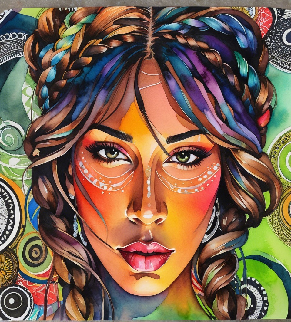 Watercolor portrait,female diva with braids, contouring outlines in watercolor and ink style by Barclay shaw and Françoise nielly, dynamic lighting 1.7, 3D, Zentangle, elegant, grunge, yribal, hues in gradient colors, beautiful acrylic art, gouache patchwork, simplistic spirals and intricate patterns, stippled, contouring outlines, zentangle lineage in green warm tones in acrylic details, green and ochre pastel, back-lit, watercolor and ink style by William Bradley, razumov and garmash style, dethereal, Stacked-up perspective, dyed stylized facial features, organic + lineage & dethereal aspects, stylized zentangle, highly natural (expressive face) in the styles of Françoise nielly and Overton Loyd, barclay shaw's watery textures for harsh look + light corrosive & acetate effect, warm tones, raytraced shadows 1.2, divisionism, plasticity 1.6, luminosity 1.9, concept art reminiscent of sgraffitto, overall composition by Françoise nielly, raytraced shadows 1.8, divisionism, minimalistic line-art features,simplistic, sculpted, baroque, cel-shaded, maximalism, radiance, cottagegore 1.7,