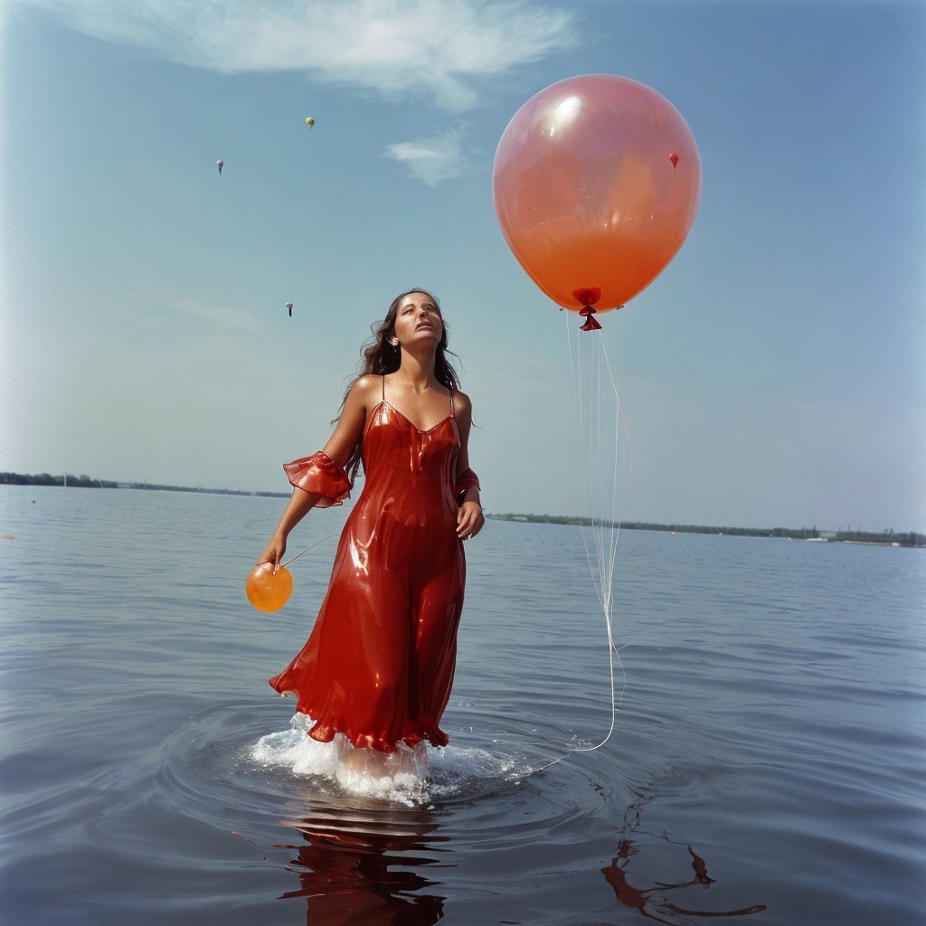 Prompt: Germany Husum 1972: running polished jelly fish (looking like lotto) with balloon antenna sparse towards eloquent waterwoman. With a tush of foamy liquid sparkle and reckless pride. 7/8. The oily strand is smeared with blood. fear of loose control. Verdunkelungsgefahr. Isolation and deny of alienism. fight of boredom against culture.