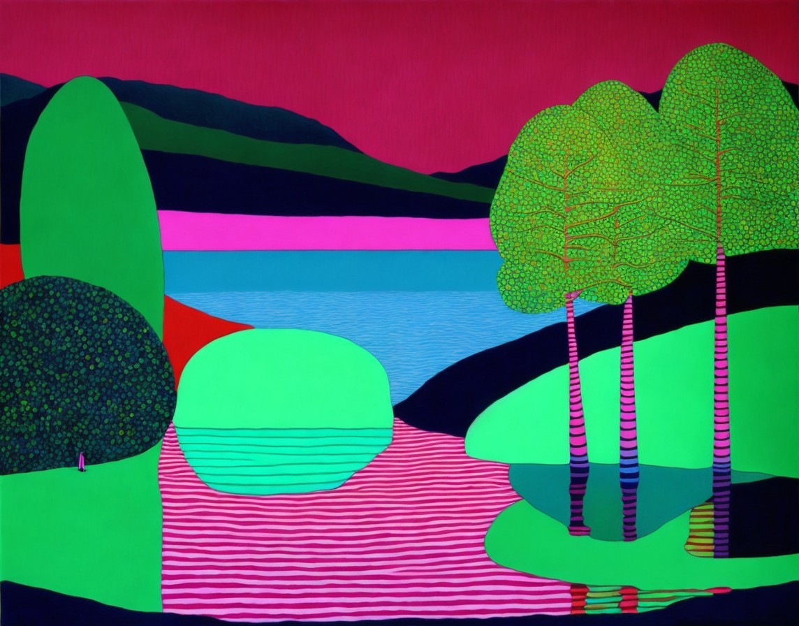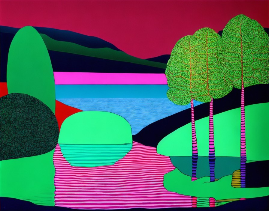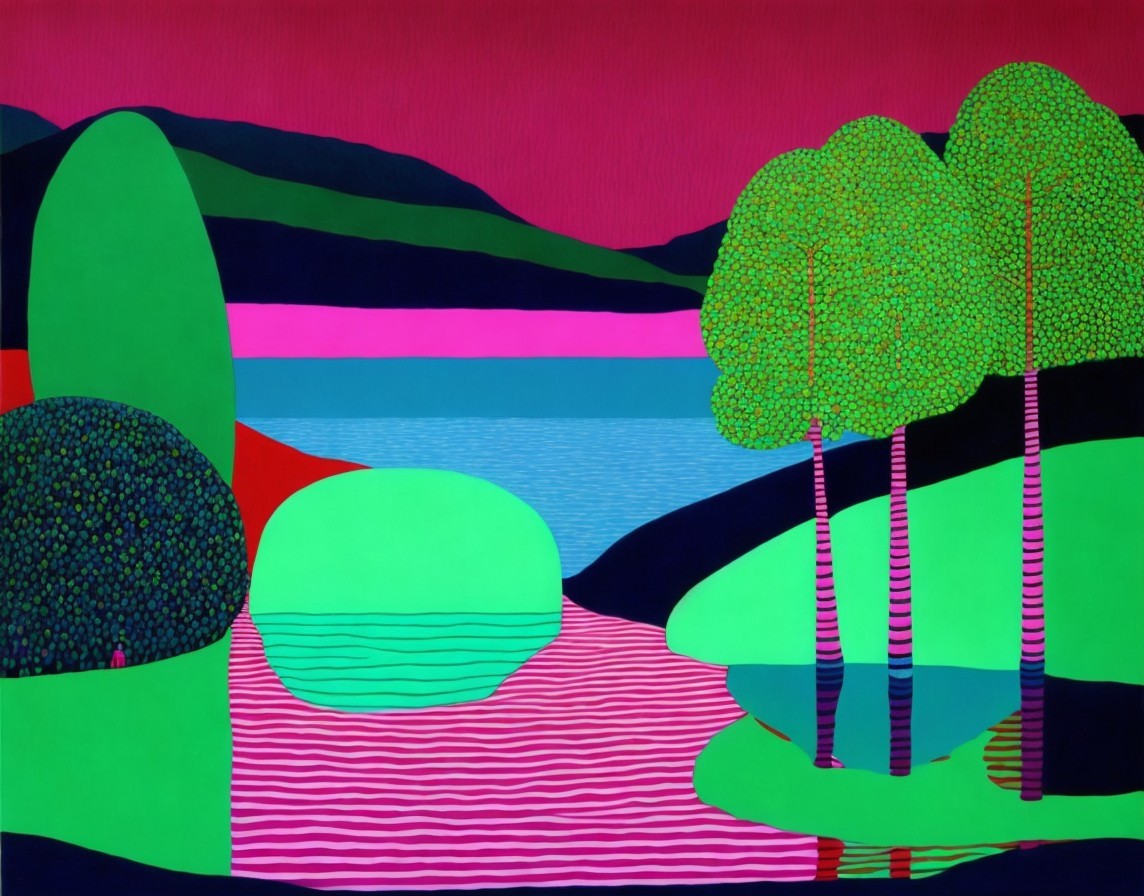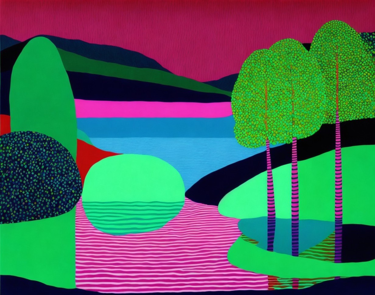 A colorful, abstract landscape with vivid hues, geometric shapes, trees, hills, and water with a prominent pink sky.
