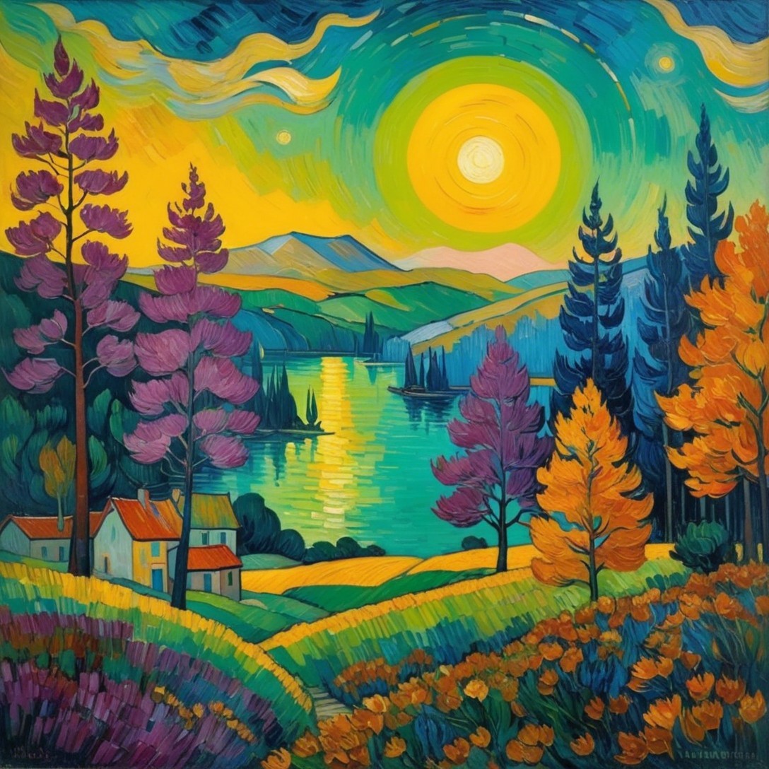 A vibrant landscape painting featuring a sunlit lake, colorful trees, and charming houses. Sailboats glide on the water, framed by rolling hills and bright, swirling skies in vivid colors.