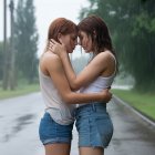 Two women kiss in the rain on a deserted road, surrounded by lush greenery. Their playful, intimate moment contrasts with the wet weather, creating a romantic and carefree atmosphere.