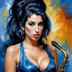 A vibrant portrait of a singer with dark hair styled in an updo, wearing a blue outfit. She holds a vintage microphone, exuding confidence against a colorful abstract background.
