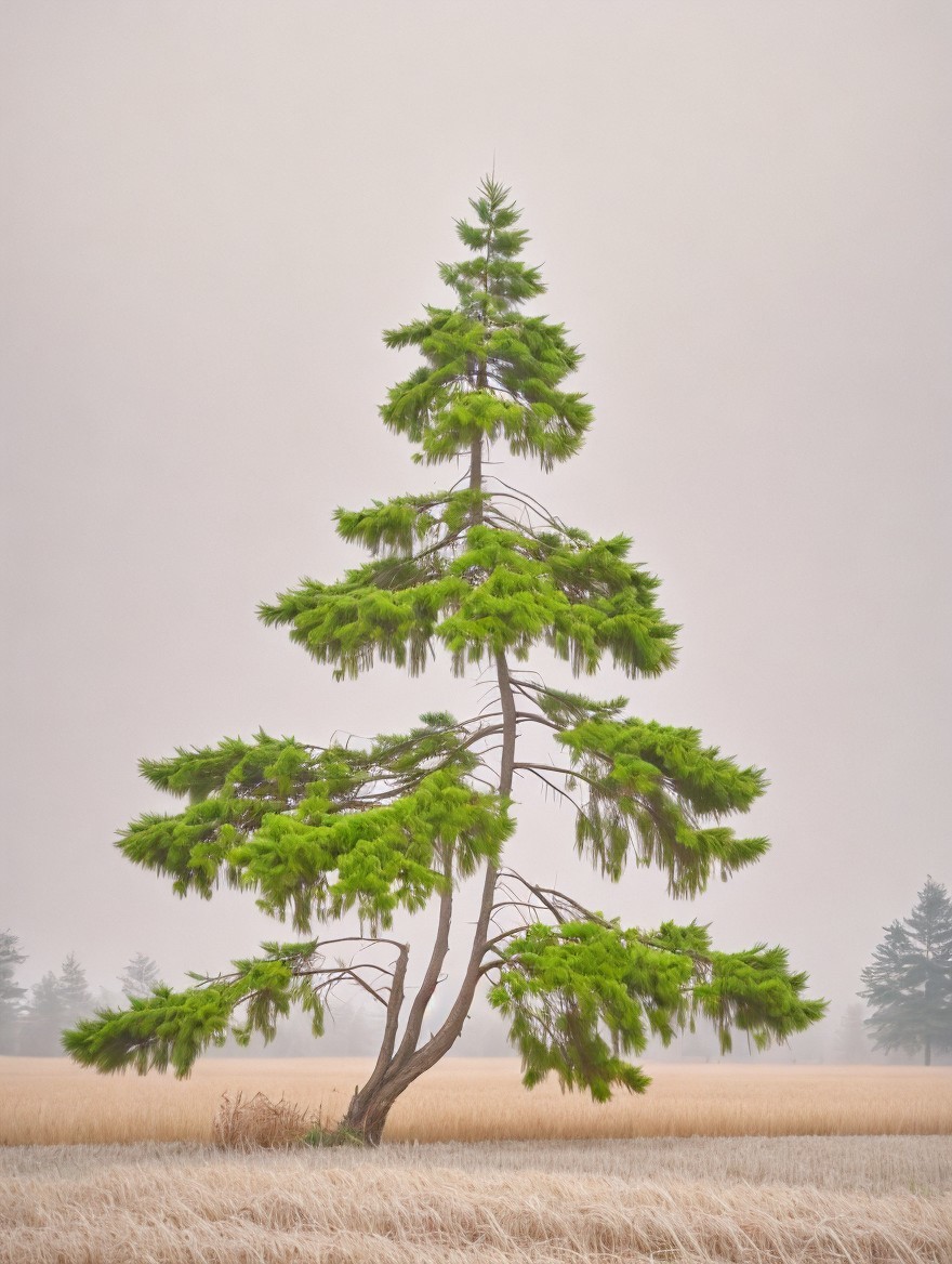 Snowfall scene: solitary pine tree in field with sunburst peeking through branches