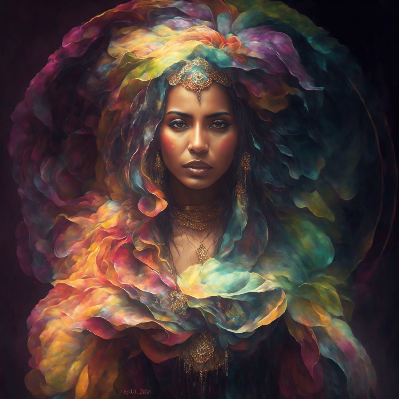Colorful portrait of a woman with majestic headpiece and ornate gold jewelry