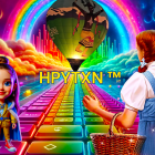 A whimsical scene features a vibrant landscape with a giant balloon resembling a globe, a rainbow arching above, and a girl in a checkered dress walking on a colorful keyboard path, holding a basket.