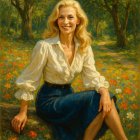 Prompt: Carmen dell ' Orifice/Julie Harris/ J.K. Rowling face, rich stylish oil painting by Tamara de Lempicka, beautiful smiling mature face, age 45, long glamorous hair, big gaunt cheekbones, thin lips, wide hips, sitting on a tree trunk in a sunlit forest full of millions of bright multicolored flowers, white open collar button-down silk blouse with puffed sleeves and big lace ruffles, black belt, blue skirt, black high heels. background features lush green trees, path, bright sunlight