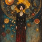 A whimsical portrait of a woman with a striking gaze, encircled by golden patterns and celestial elements. Her vibrant attire and intricate details create a dreamlike, ethereal atmosphere.