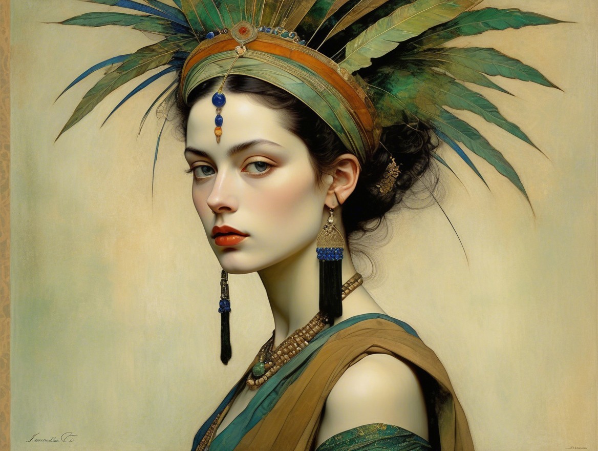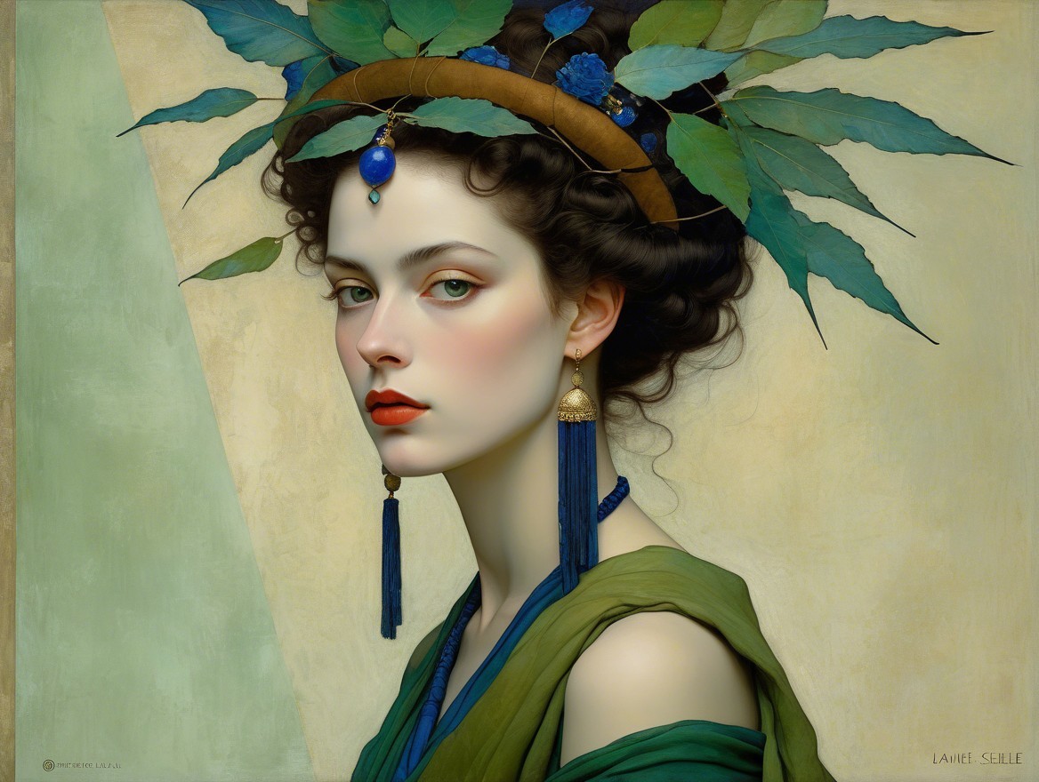 A portrait of a woman with curly hair, a blue flower in her hair, and a green scarf, against a muted background with a circular motif.