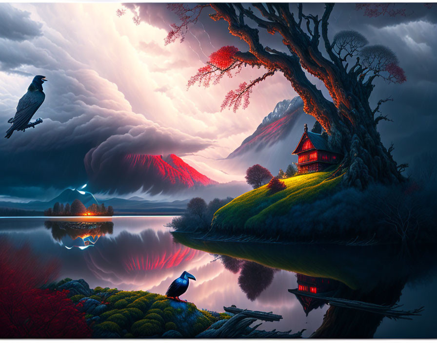 Prompt: Epic cinematic breathtaking intricate insanely detailed painting of swooping ravens amid dramatic storm clouds and red moonlight glow on an aesthetic remarkable old white oak tree, river, winding path, remote village & mountains, by tomasz allen kopera, dariusz zawadzki, andreja peklar, ivan shiskin, beautiful, colorful, cosmic, ultra detailed, ultra realistic, a masterpiece, polished, crisp quality