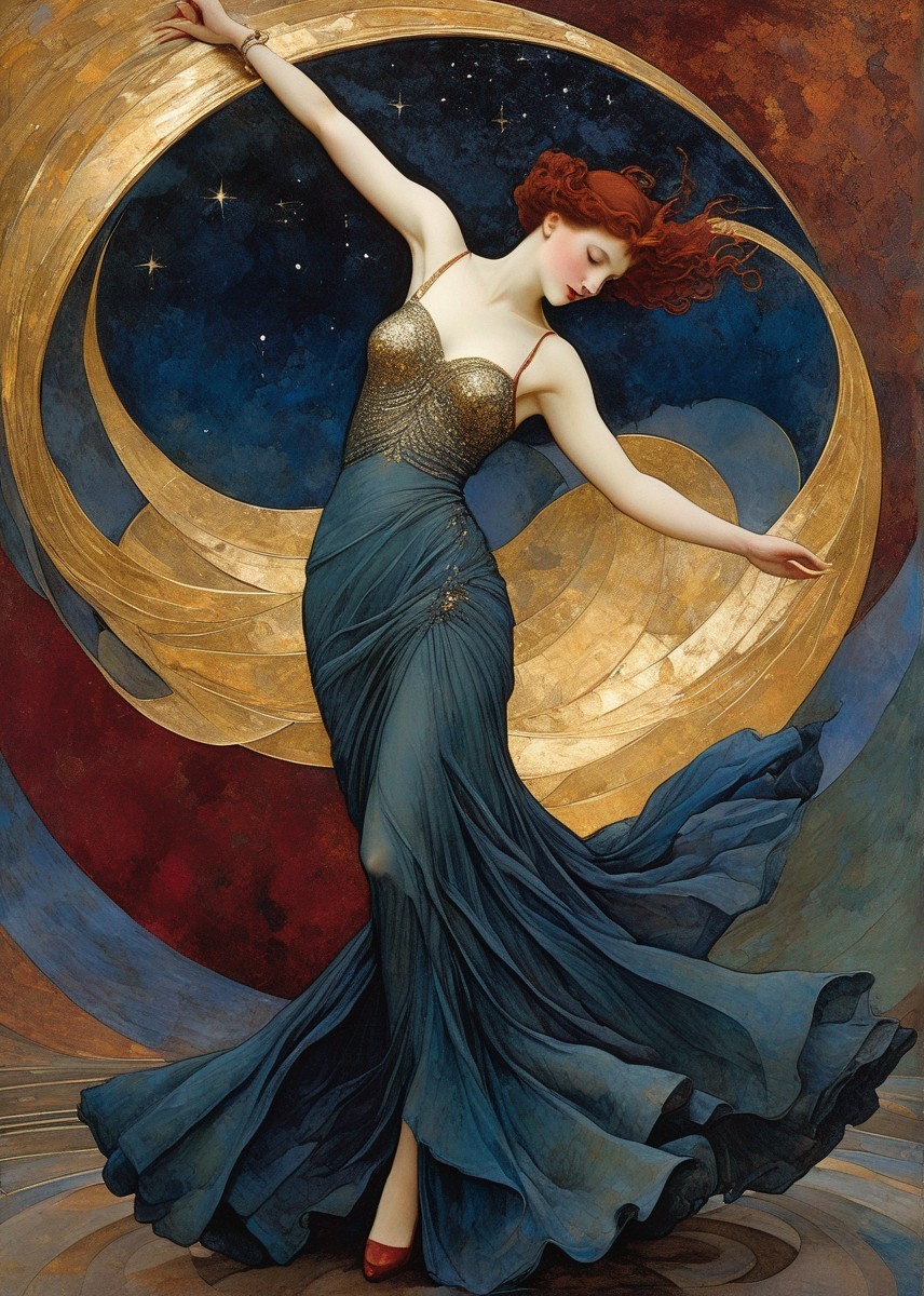 Klimt paint affiche for Moulin Rouge spectacle in Paris, soft watercolor extra water in Art Deco by Annigoni, Egon Schiele, Milo Manara, Botticelli, Catrin Welz-Stein, Jean Metzinger, Klimt, perfect eyes, perfect handsface, highly detailed, complementary colors, hyper detailed. Watercolor and ink splatter, dynamic pose, dark blue background, unreal engine, greg rutkowski, loish, rhads, beeple, makoto shinkai and lois van baarle, ilya kuvshinov, rossdraws, tom bagshaw, alphonse mucha, global illumination, detailed and intricate environment