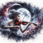 A graceful figure plays a violin under a luminous moon, surrounded by swirling musical notes and a dreamy, cosmic backdrop filled with stars and ethereal colors.