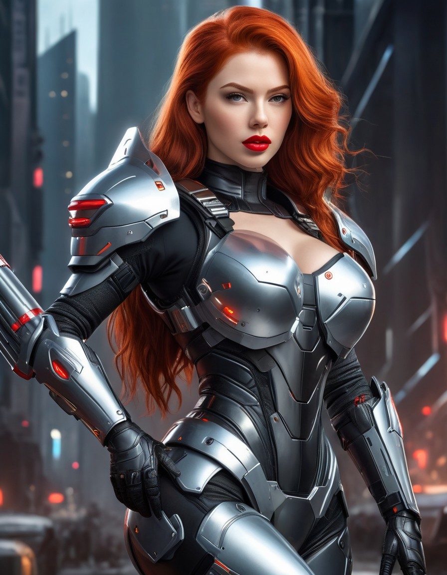 A person with red hair and futuristic armor stands confidently with a blurred cityscape background.