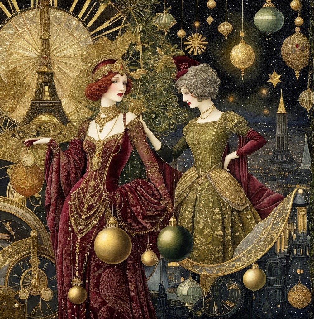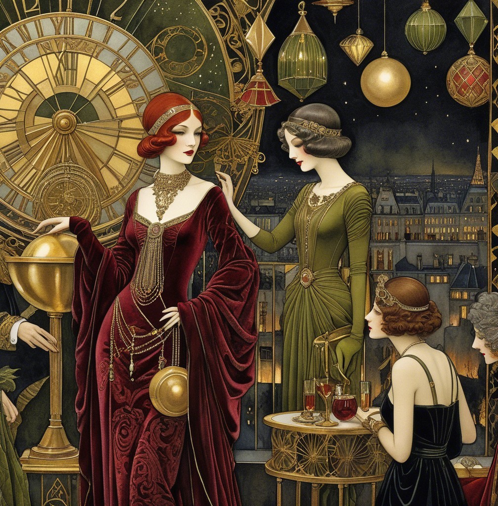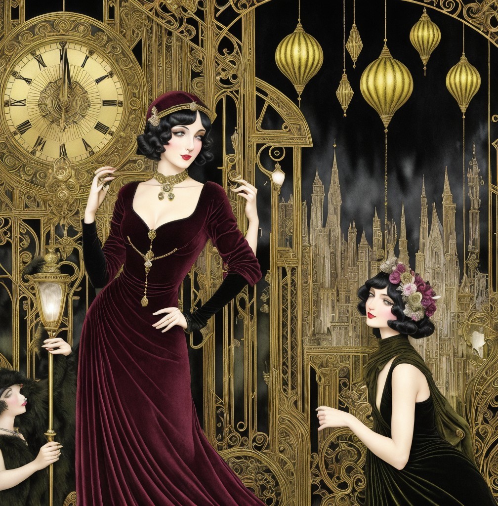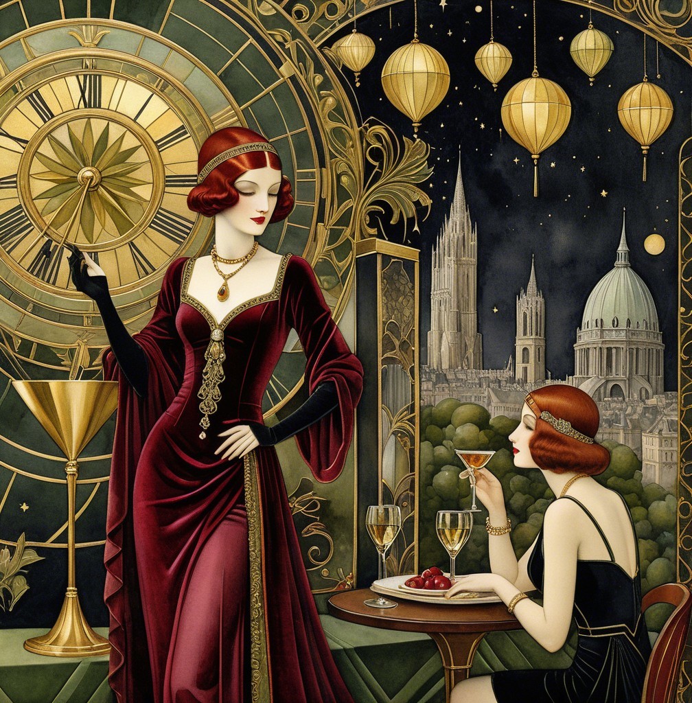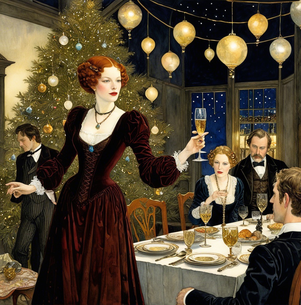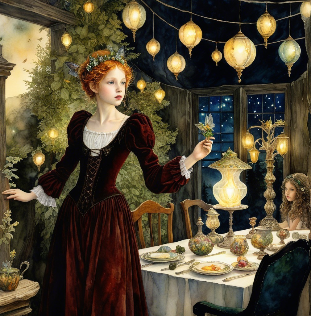 A mystical fairy stands in an enchanting forest, illuminated by glowing lanterns. She wears a dark gown and holds a leaf, surrounded by a beautifully set table filled with delicacies.