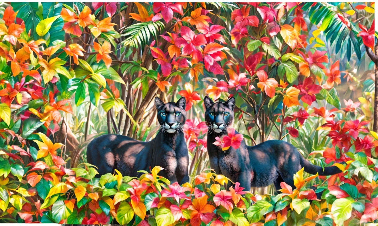 Black Panthers in Vibrant Tropical Foliage with Colorful Flowers