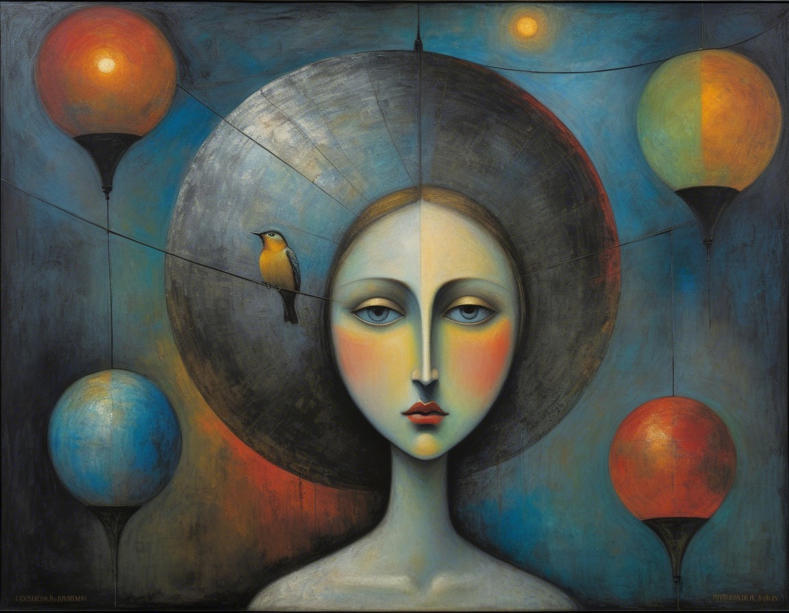 A woman with ethereal features gazes forward, framed by colorful balloons and a small bird. The background is a dreamy blend of blues and yellows, creating a surreal, whimsical atmosphere.