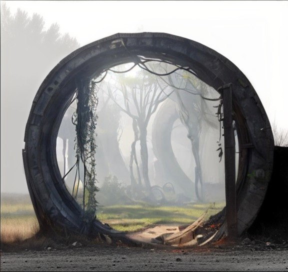A mystical archway in a barren, dead lanscape leads into an enigmatic forest with intertwining trees, flowers and ethereal light.