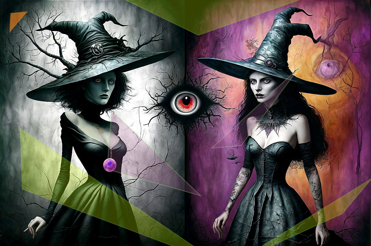witches with large hats by dark tree silhouette, horror,. a simulacrum of Igor Morski work. Eyes. Sci fi surrealism. Dave McKean mixed media, tree. hats that are alive with eyes, behind broken colored mirrors. Evil eye levitating. Paul Klee inspired, a mix of photorealistic Marc Chagall art collage and absurdism. metallic paint and newspaper clippings. Modifiers: dof portrait beautiful high detail colourful fine art Marc Chagall Cubism by Paul Klee By Dan Witz Stephen Gammel