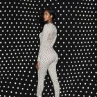 A model poses against a dotted black backdrop, wearing a sheer, net-like bodysuit that highlights her silhouette, paired with chunky white boots for a bold fashion statement.