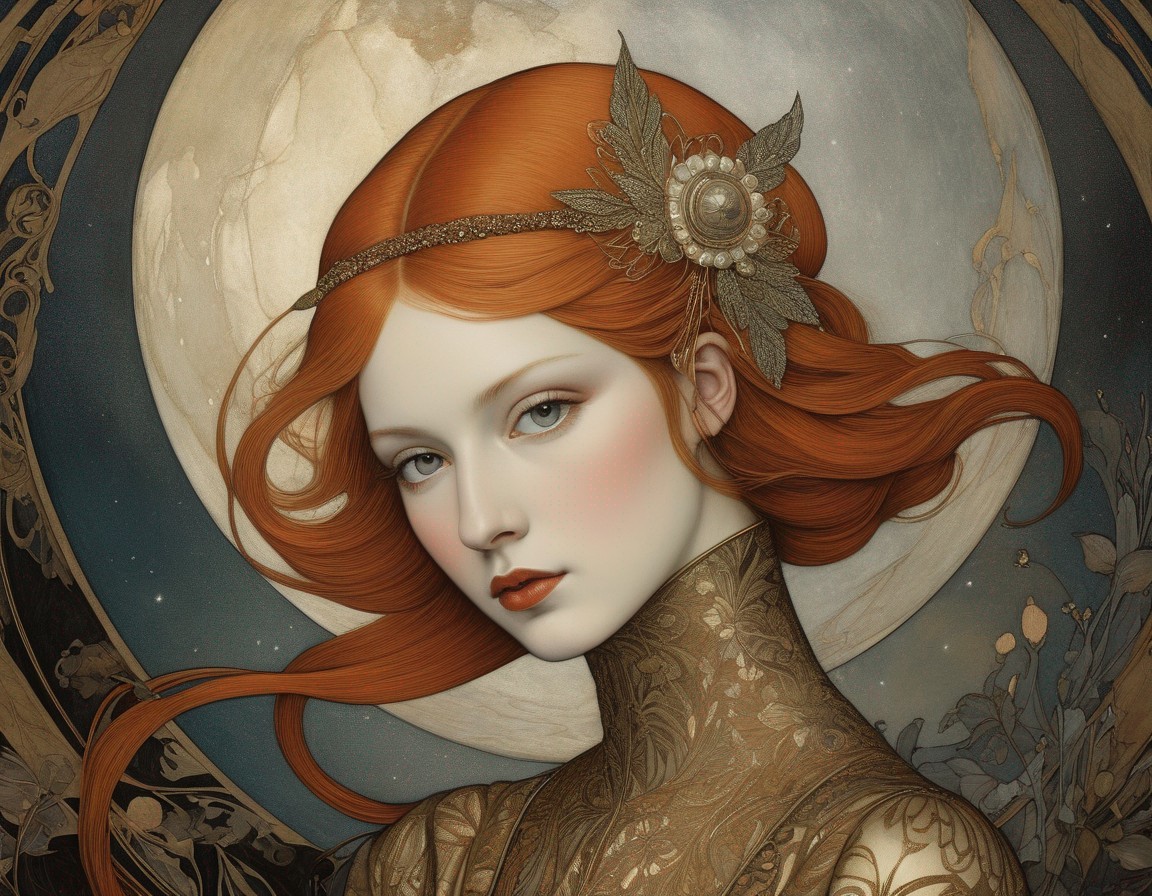 An artwork of a woman with red hair and ornate headpiece set against a moon backdrop, with intricate details and earthy tones.
