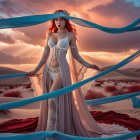 A striking scene of a red-haired woman in elegant lingerie kneeling amidst swirling fabric, set against a dramatic desert landscape illuminated by a stormy sky and lightning.