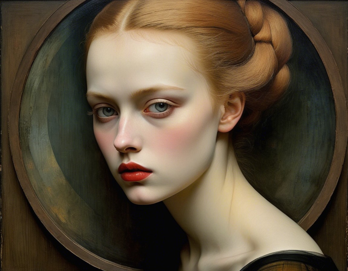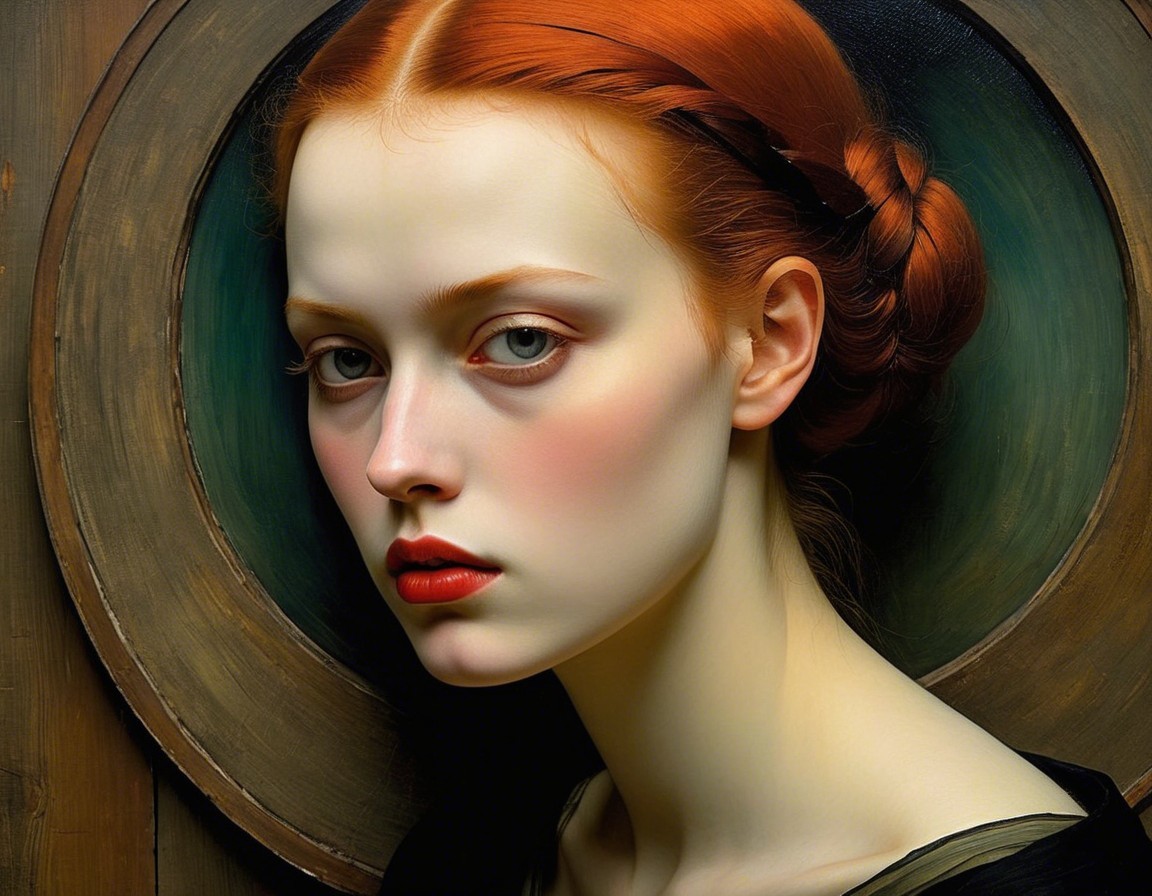 The image features a young woman with striking red hair styled in a braid, set against a circular, colorful background. Her expression is serene, highlighting smooth features and bright lips.