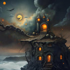 A whimsical, eerie landscape features a dark stone castle perched atop twisted roots. The sky is filled with swirling clouds, glowing orbs, and flying creatures, creating a mystical atmosphere.