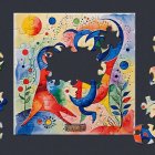 A vibrant, abstract artwork features playful shapes in blue, red, and yellow, surrounded by scattered puzzle pieces, creating an engaging and incomplete visual story.