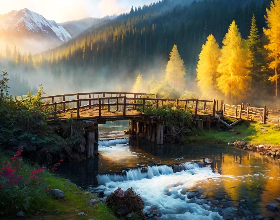 Wooden bridge over a stream with rapids, surrounded by misty forest and mountains.
