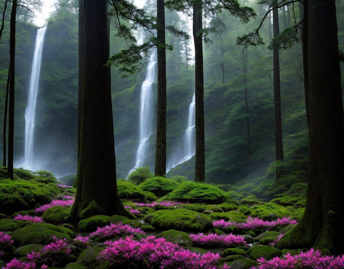 Waterfalls in Misty Forest with Pink Flowers and Moss