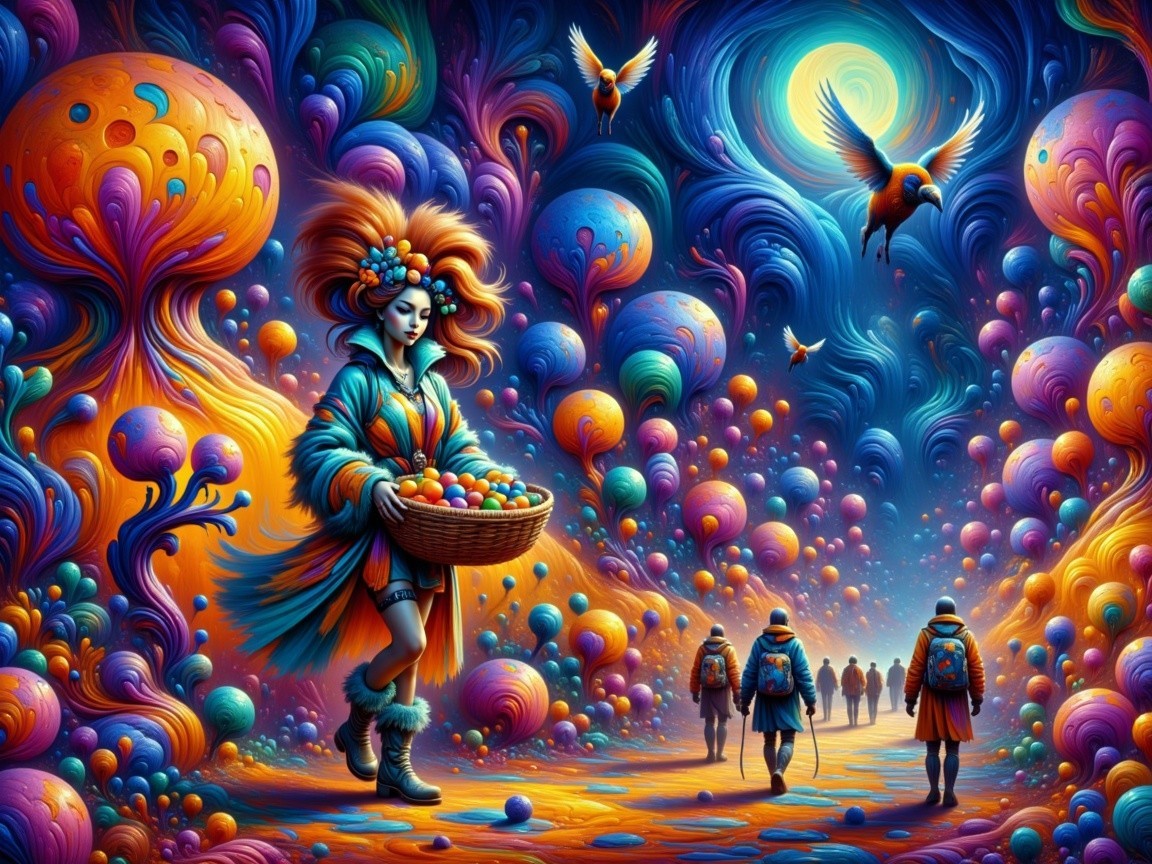 A fantastical market scene filled with oversized fruits and vibrant hot air balloons. A woman in a fur-lined coat carries a basket, surrounded by magical elements under a glowing moonlit sky.