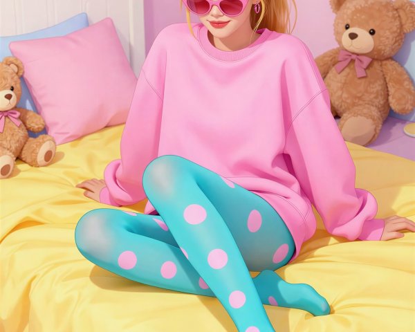 In a futuristic lounge, a young woman sits confidently at a table, wearing a stylish outfit adorned with vibrant details. A colorful cocktail rests beside her, surrounded by a sleek, modern setting.