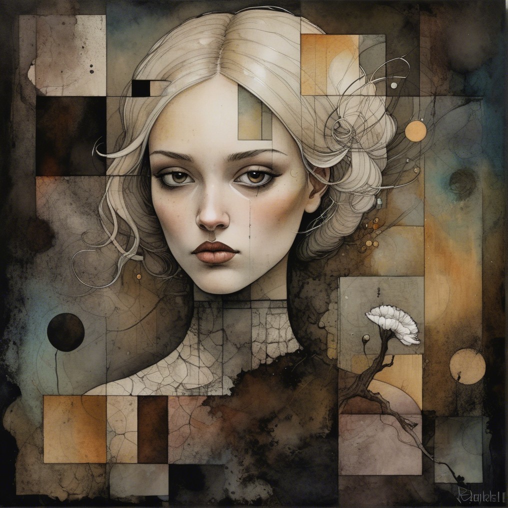 A striking portrait of a young woman with a soft expression, adorned with an intricate hairstyle. The background features abstract patterns in muted tones, adding a mystical, artistic feel.