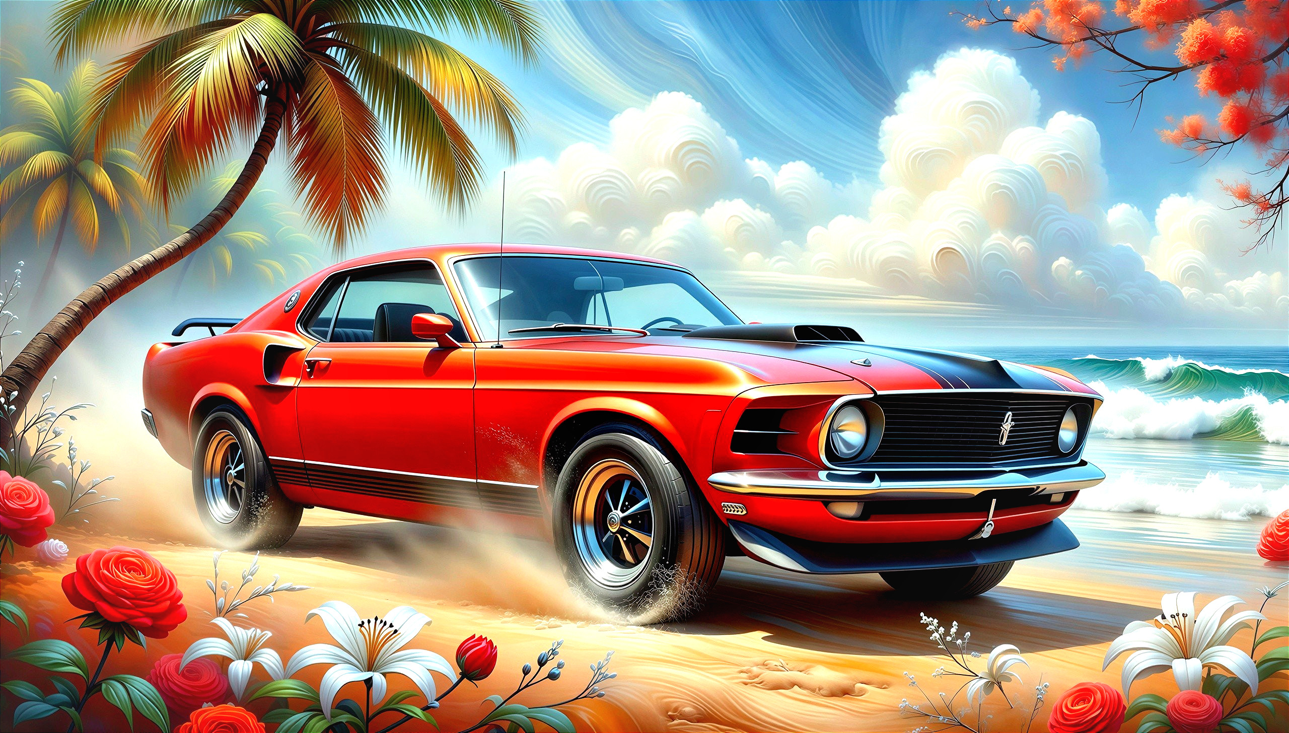 A glossy red classic sports car, possibly a Ford Mustang, with a black racing stripe on the hood, is positioned at an angle on a sandy or dusty path next to a tropical beach. The car is depicted in motion, kicking up dust and dirt from its tires. Behind the car, a large