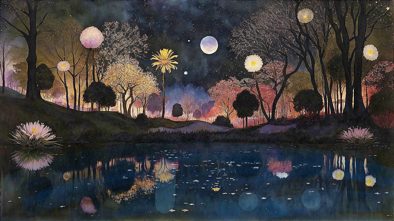 A serene landscape at twilight features two luminous moons hovering over a tranquil lake. Surrounding trees reflect vibrant autumn colors and starry skies, creating a dreamlike atmosphere.