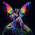 A vibrant fairy with colorful wings sits by a serene waterfall, surrounded by sparkling gems. Her iridescent outfit complements the lush green surroundings, creating a magical, enchanting scene.