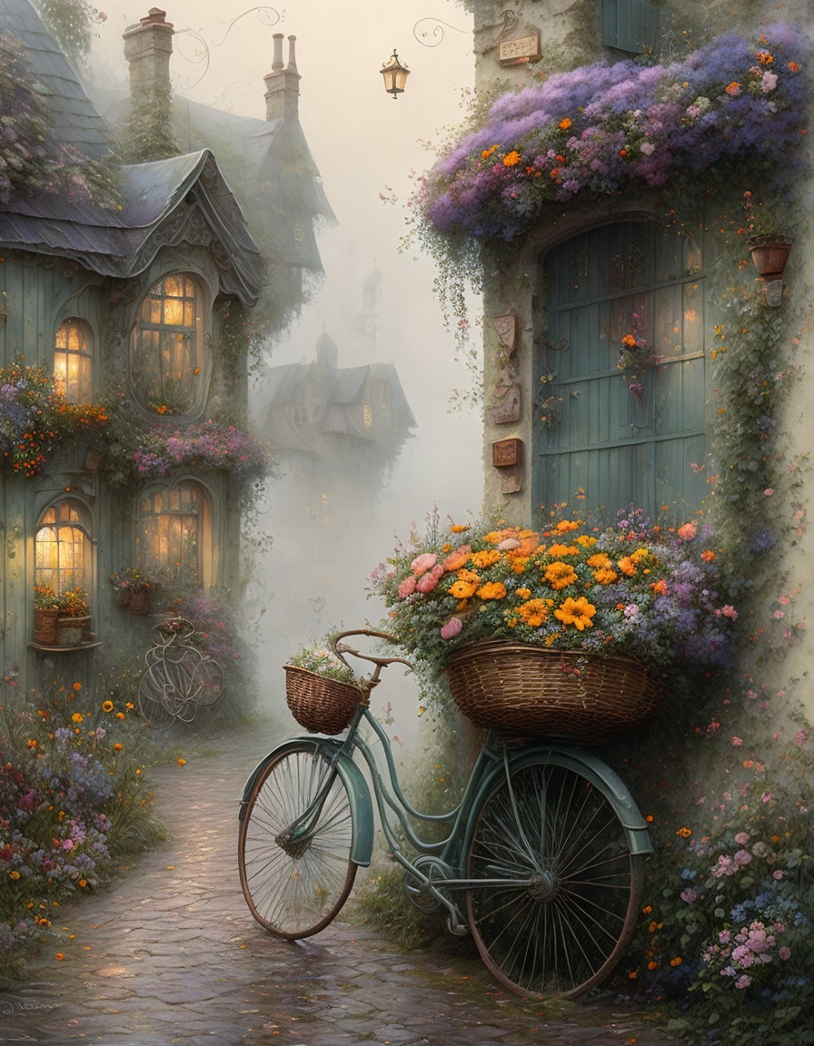 A quaint cobblestone alley with lush flowers on a vintage bicycle and creeping vines on foggy, enchanting cottages.