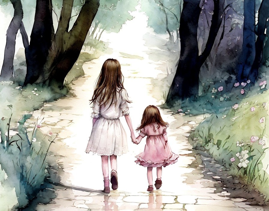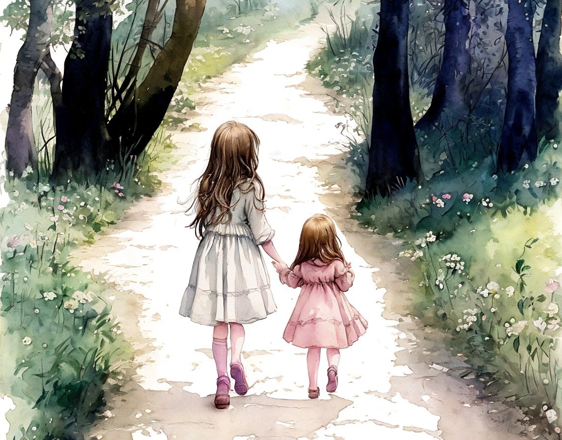 Two girls walking together on a forest path surrounded by trees and flowers. There should be a general store at the end of the path; I guess it's a little further on. LOL!