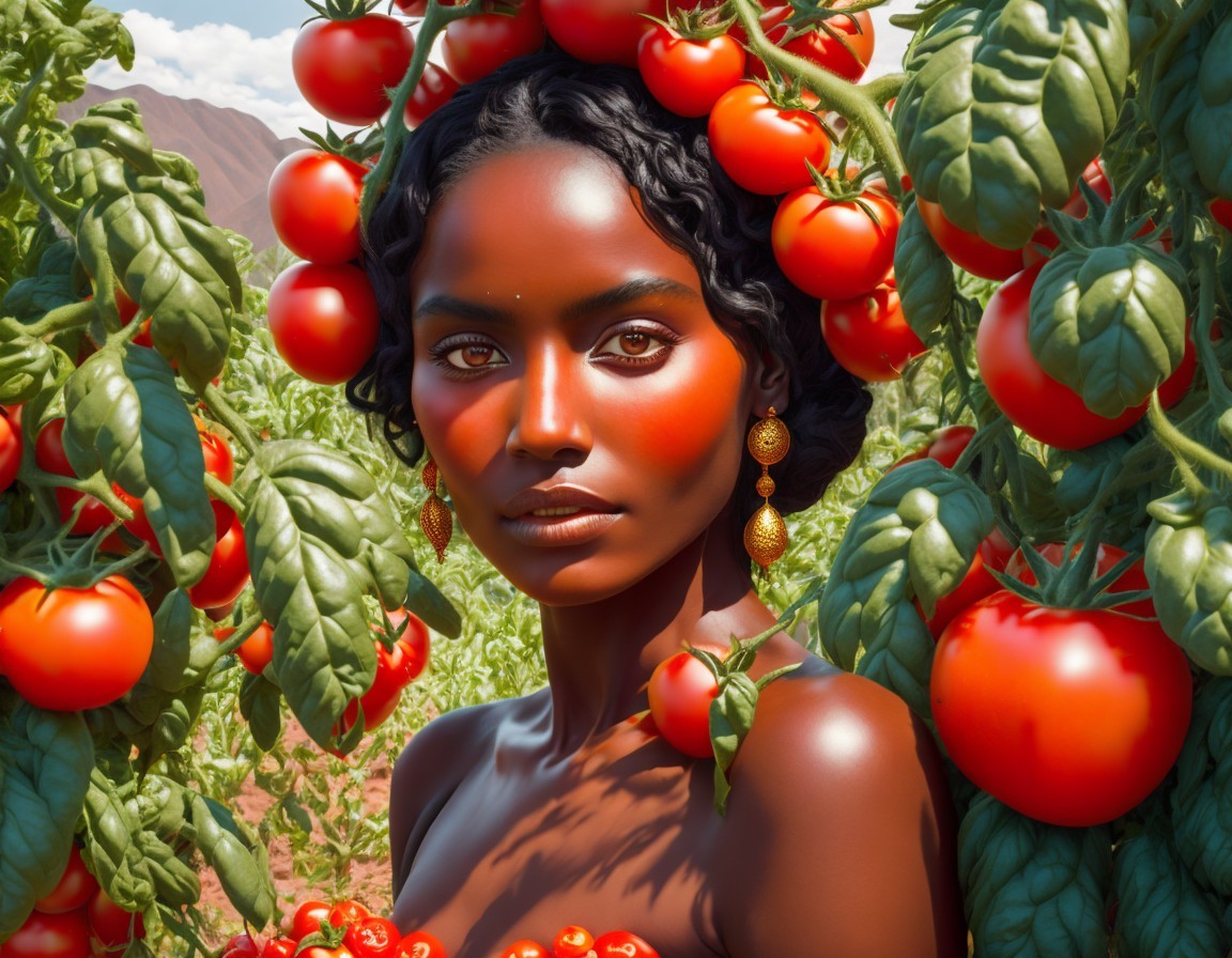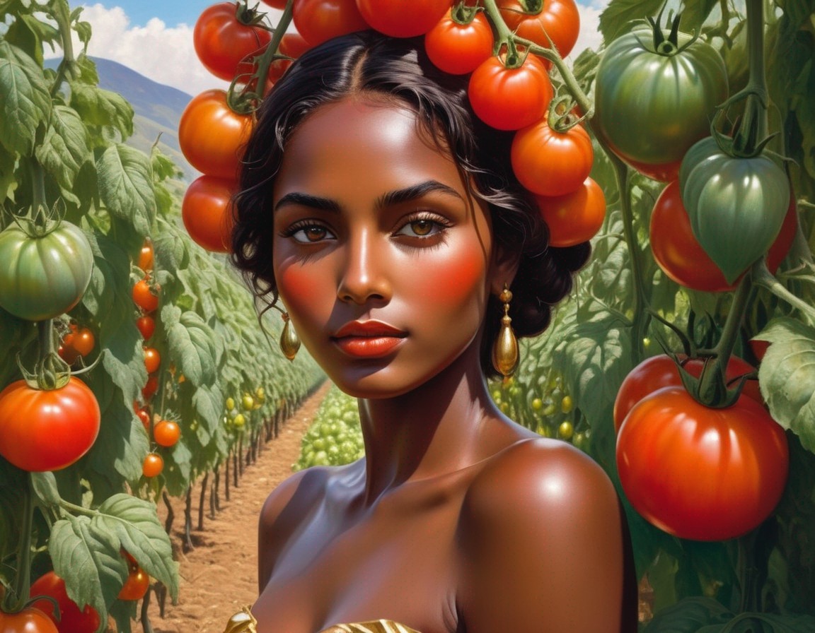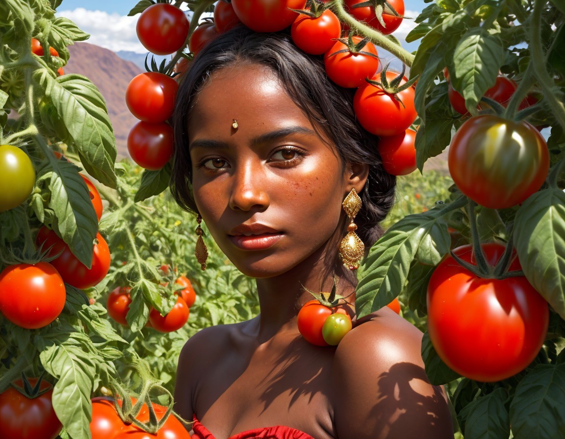 the tomato goddess. Dark, bronze-hued skin glowing with gold, deep, expressive eyes with the reflection of tomatoes in them. Background-Tomato plantation in the Andes mountains with drooping bunches of tomatoes