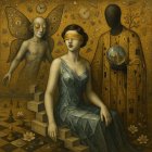 A surreal composition featuring a blindfolded woman in a geometric dress, surrounded by abstract elements like a clock, spirals, a butterfly, and a golden background, evoking a dreamlike atmosphere.