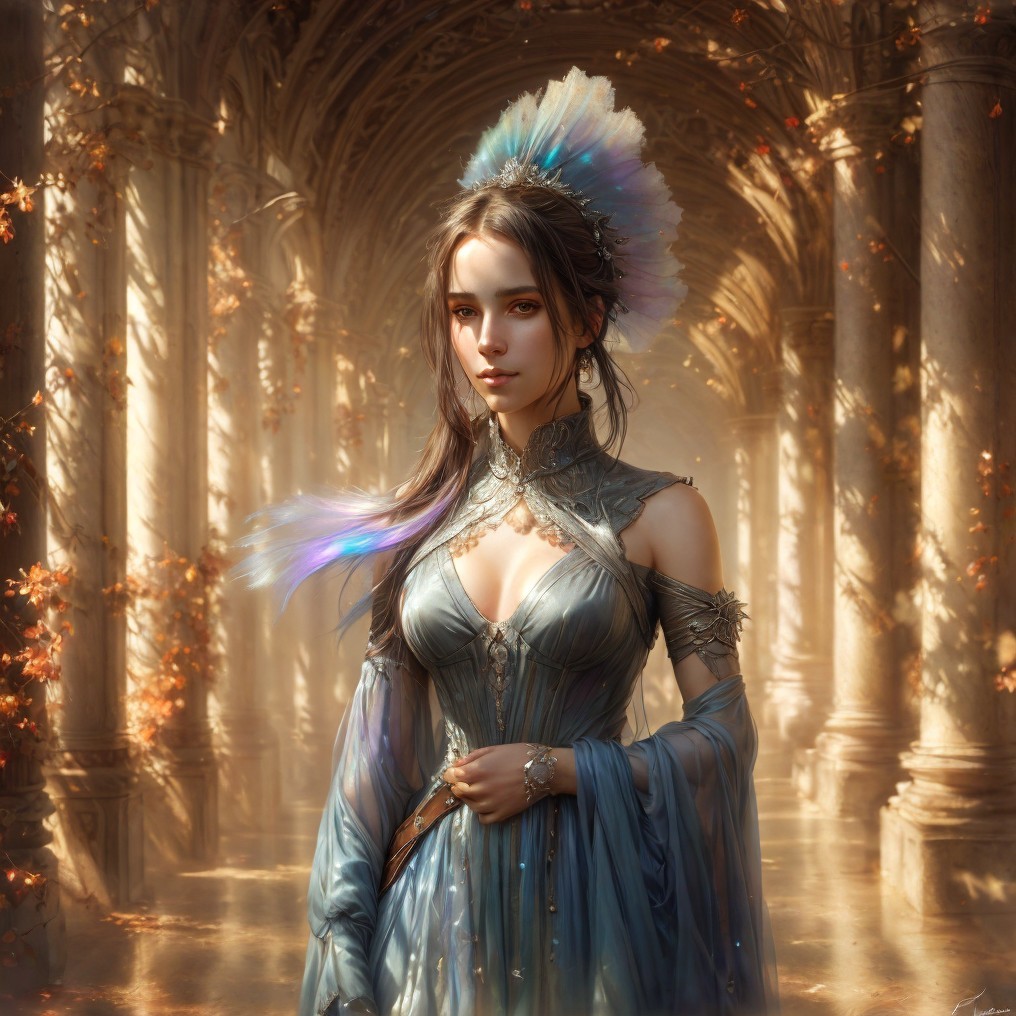 + Prompt:Artist Jean-Baptiste Monge style Confident expression with slight mysterious smile ethereal and dreamlike lighting, in the style of realistic and hyper-detailed renderings, meticulous shading, extreme iridescent reflection overexposure, glistening mesmerizing color , Todd McFarlane, glowing The art style of Serge Marshennikov